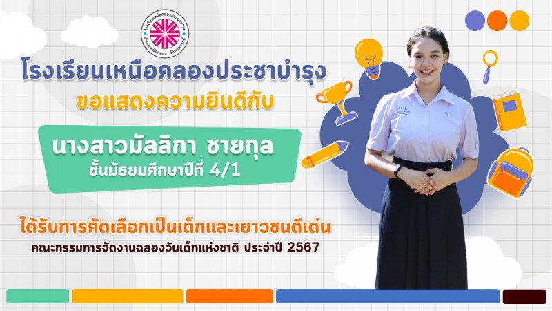 โรงเรียนเหนือคลองประชาบำรุง ขอแสดงความยินดีกับนางสาวมัลลิกา ชายกุล นักเรียนชั้นมัธยมศึกษาปีที่ 4/1 ได้รับการคัดเลือกเป็นเด็กและเยาวชนดีเด่น เด็กและเยาวชนที่นำชื่อเสียงมาสู่ประเทศชาติ ประจำปี 2567 โดยได้เข้าเยี่ยมคารวะและรับโอวาท จากนายเศรษฐา ทวีสิน นายกรัฐมนตรี พร้อมทั้งรับโล่รางวัล จากพลตำรวจเอกเพิ่มพูน ชิดชอบ รัฐมนตรีว่าการกระทรวงศึกษาธิการ ณ ตึกสันติไมตรี ทำเนียบรัฐบาล กรุงเทพมหานคร |