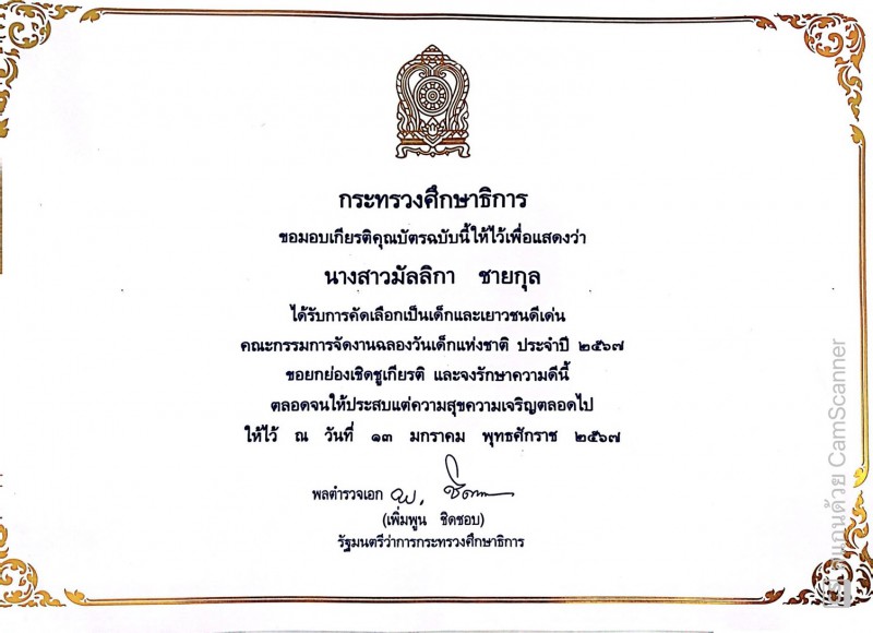 ขอแสดงความยินดีกับนางสาวมัลลิกา ชายกุล นักเรียนชั้นมัธยมศึกษาปีที่ 4/1