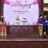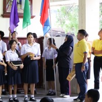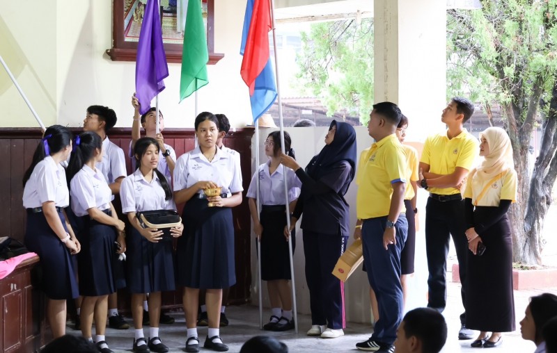 พิธีมอบธงกีฬาสี จำนวน 5 สี ได้แก่ สีแดง สีเหลือง สีเขียว สีฟ้าและสีม่วง แก่ประธานสีและแม่สีแต่ละคณะ