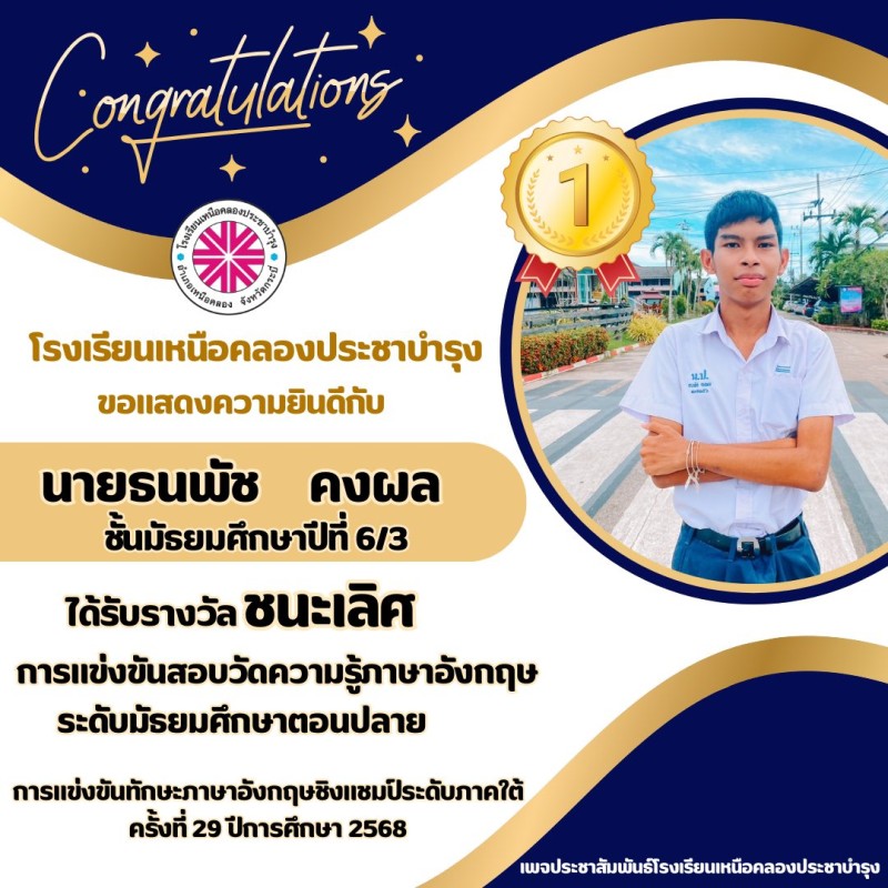 ในนามคณะผู้บริหาร คณะครู บุคลากรทางการศึกษาและนักเรียนโรงเรียนเหนือคลองประชาบำรุง ขอแสดงความยินดีกับ นายธนพัช คงผล นักเรียนชั้นมัธยมศึกษาปีที่ 6/3 ได้รับรางวัลชนะเลิศ การแข่งขันสอบวัดความรู้ภาษาอังกฤษ(Paper Test) ระดับชั้นมัธยมศึกษาตอนปลาย รายการการแข่งขันทักษะภาษาอังกฤษชิงแชมป์ระดับภาคใต้ ครั้งที่ 29 (English Contest 29th) ปีการศึกษา 2568 ณ โรงเรียนศรีธรรมราชศึกษา จังหวัดนครศรีธรรมราช