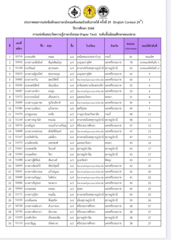 การแข่งขันสอบวัดความรู้ภาษาอังกฤษ(Paper Test) ระดับชั้นมัธยมศึกษาตอนปลาย