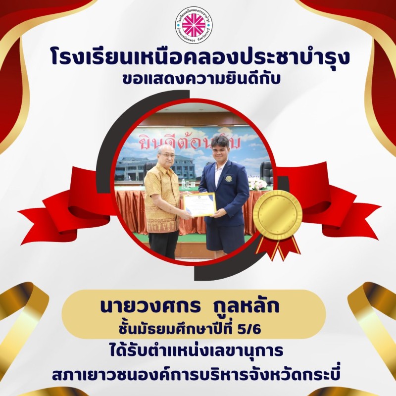 วันที่ 15 สิงหาคม 2568 งานประชาธิปไตยในโรงเรียน กลุ่มบริหารงานบุคคลและงานกิจการนักเรียน โรงเรียนเหนือคลองประชาบำรุง โดย คุณครูสุทธิดา วตะภรณ์ ครูผู้รับผิดชอบงานประชาธิปไตยในโรงเรียน นำตัวแทนนักเรียน ได้แก่ นายวงศกร กูลหลัก ประธานคณะกรรมการสภานักเรียน ชั้นมัธยมศึกษาปีที่ 5/6 เข้าร่วมโครงการเยาวชนเพื่อพัฒนาประชาธิปไตย "กิจกรรมอบรมเสริมสร้างภาวะผู้นำคณะกรรมการสภาเยาวชน องค์การบริหารส่วนจังหวัดกระบี่" ประจำปีงบประมาณ 2568 เพื่อส่งเสริมและพัฒนาศักยภาพความเป็นผู้นำของเยาวชนให้มีความสามารถมีส่วนร่วมในท้องถิ่นและเป็นกระบอกเสียงสำคัญของเยาวชนในการแสดงความคิดเห็นข้อเสนอแนะและสะท้อนความต้องการในพื้นที่ของตน จัดโดยองค์การบริหารส่วนจังหวัดกระบี่ ในการนี้ นายวงศกร กูลหลัก ยังได้รับการคัดเลือกในตำแหน่งเลขานุการสภาเยาวชนองค์การบริหารจังหวัดกระบี่ ณ ห้องประชุมพระนาง องค์การบริหารส่วนจังหวัดกระบี่ ทางโรงเรียนขอแสดงความยินดีกับนักเรียนและขอให้นักเรียนได้พัฒนาตนเองอย่างเต็มศักยภาพในทุกๆกิจกรรม |