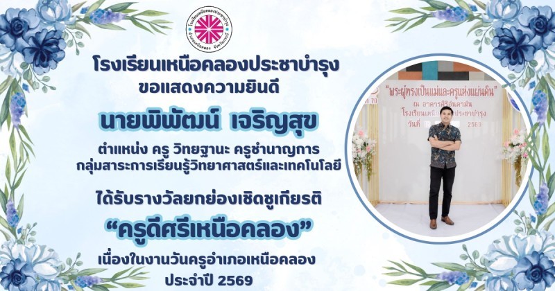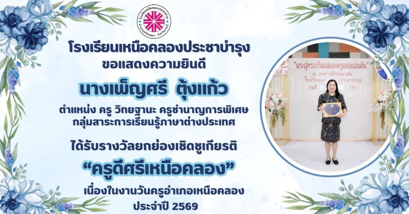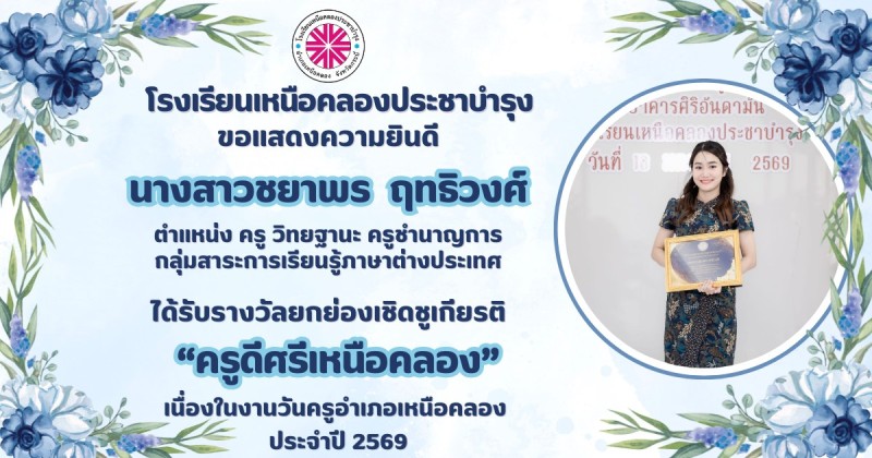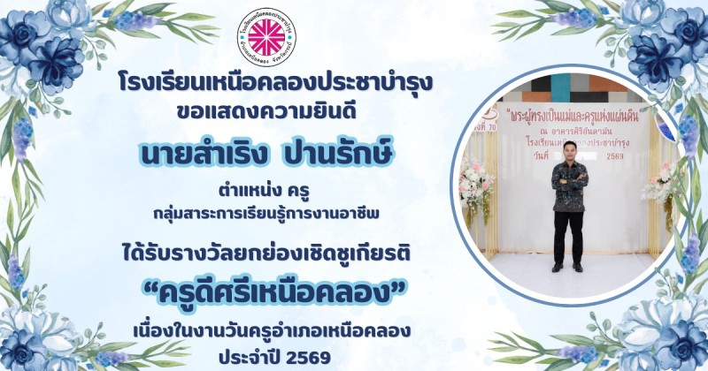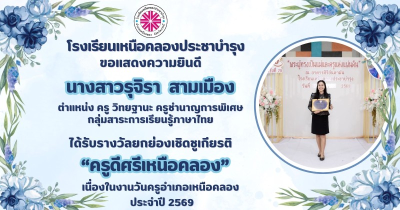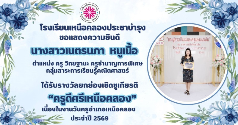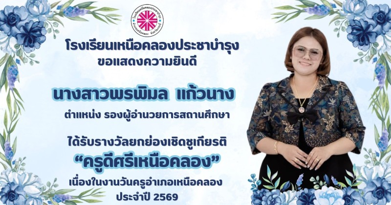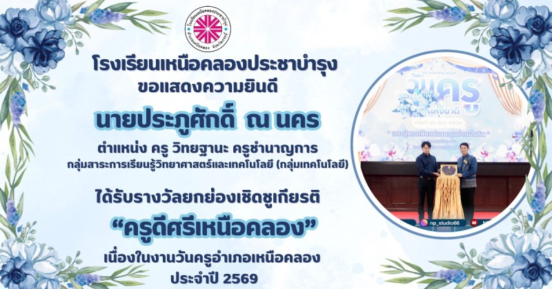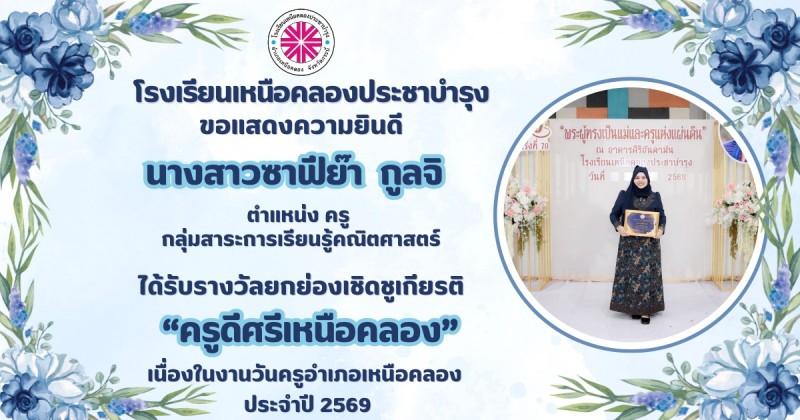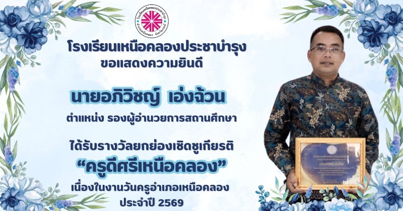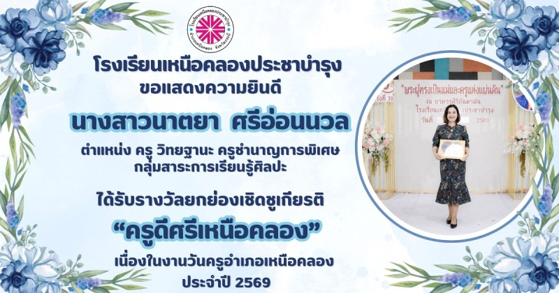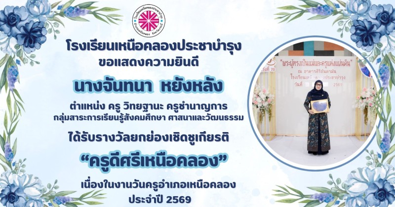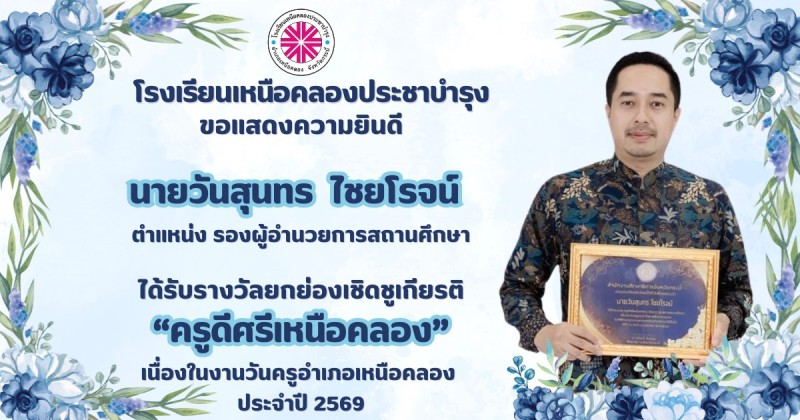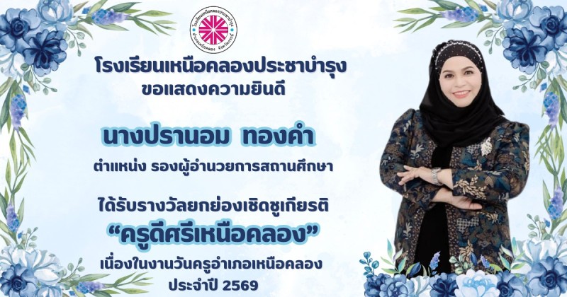 ขอแสดงความยินดีกับ คณะผู้บริหาร คณะครูและบุคลากรทางการศึกษา ที่ได้รับรางวัลยกย่องเชิดชูเกียรติ "ครูดีศรีเหนือคลอง" เนื่องในงานวันครูอำเภอเหนือคลอง ประจำปี 2569