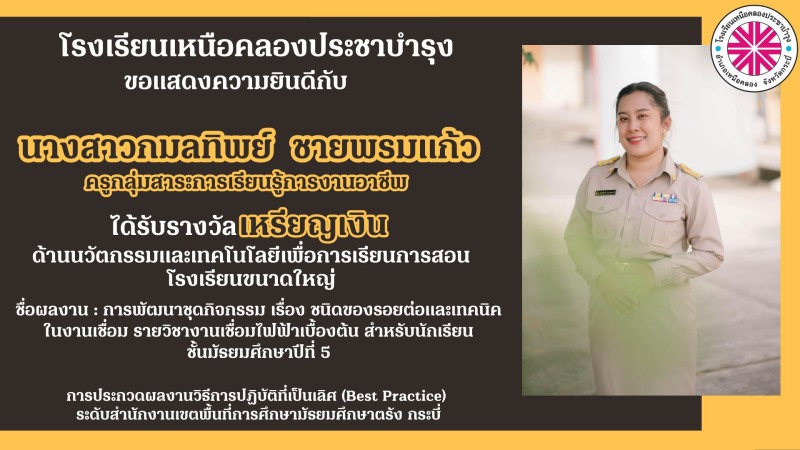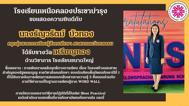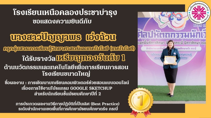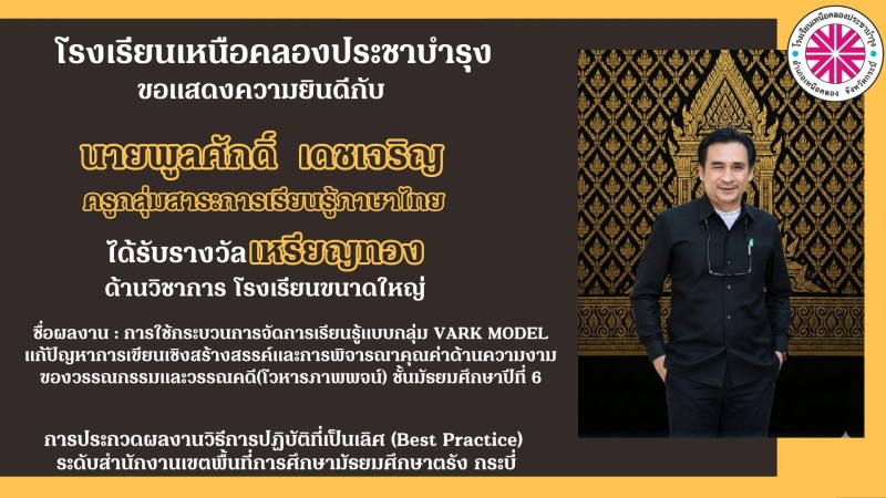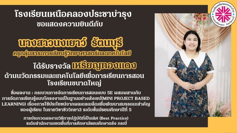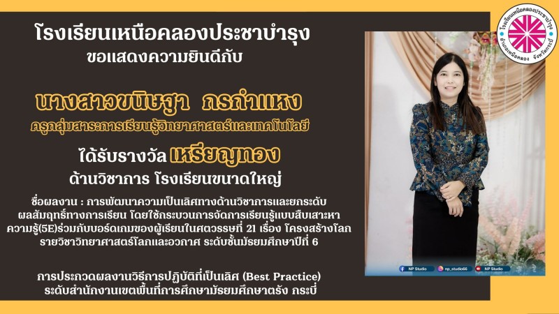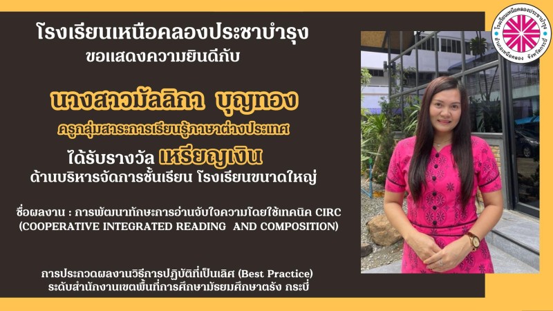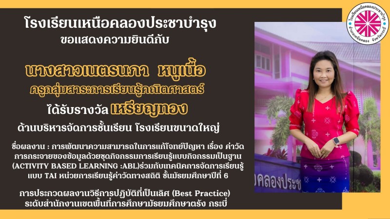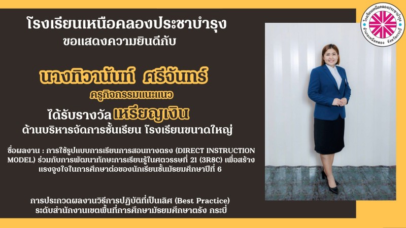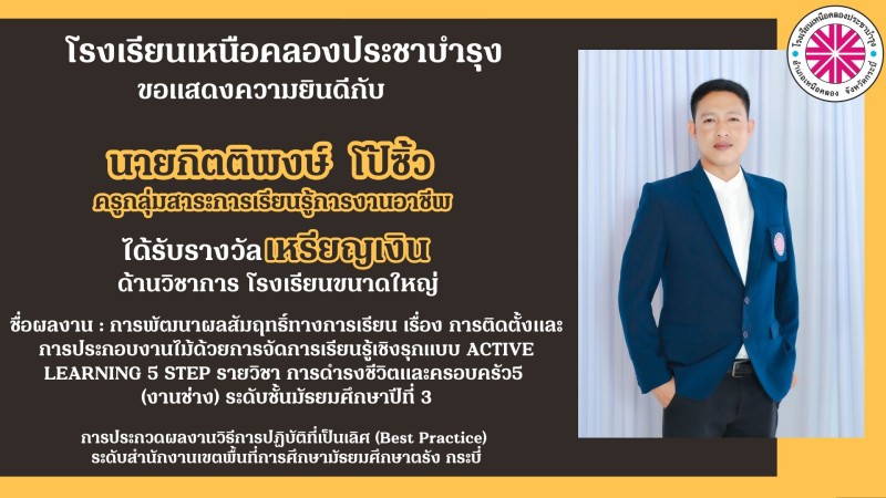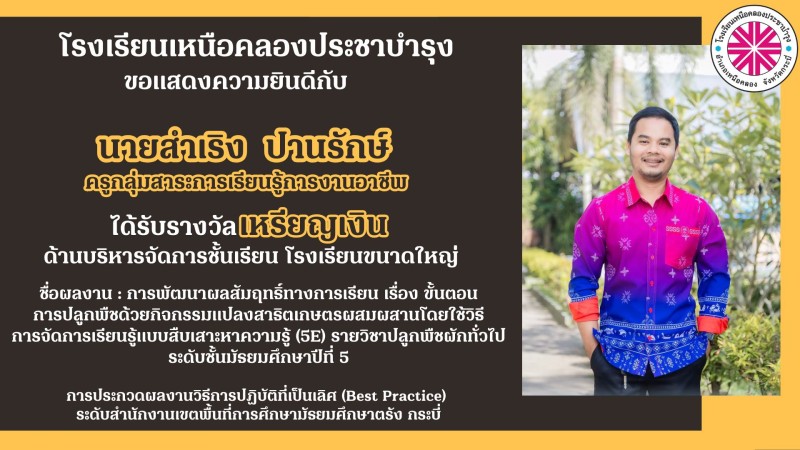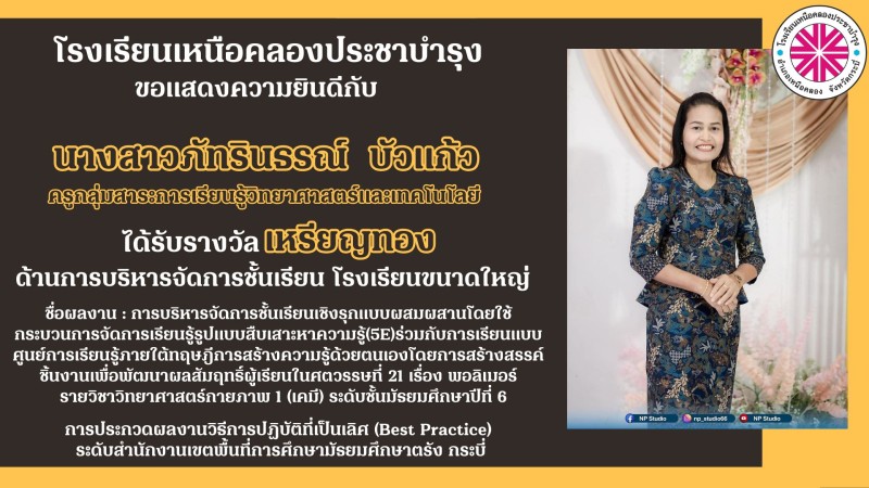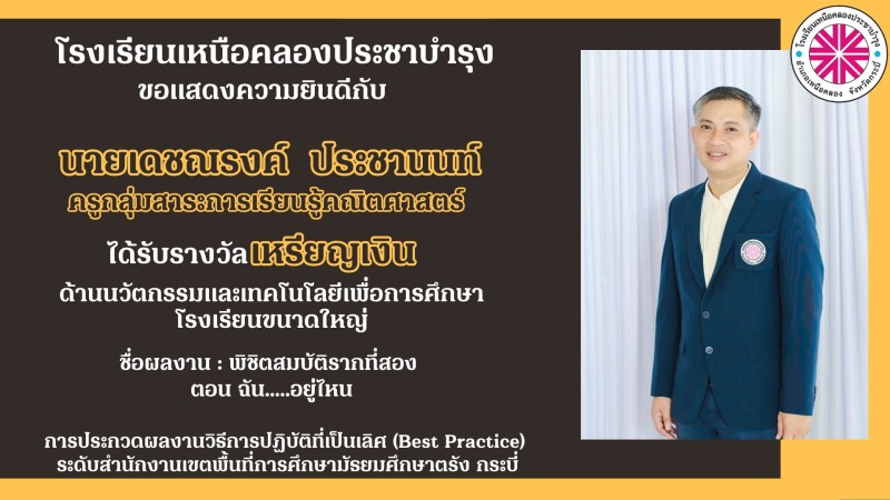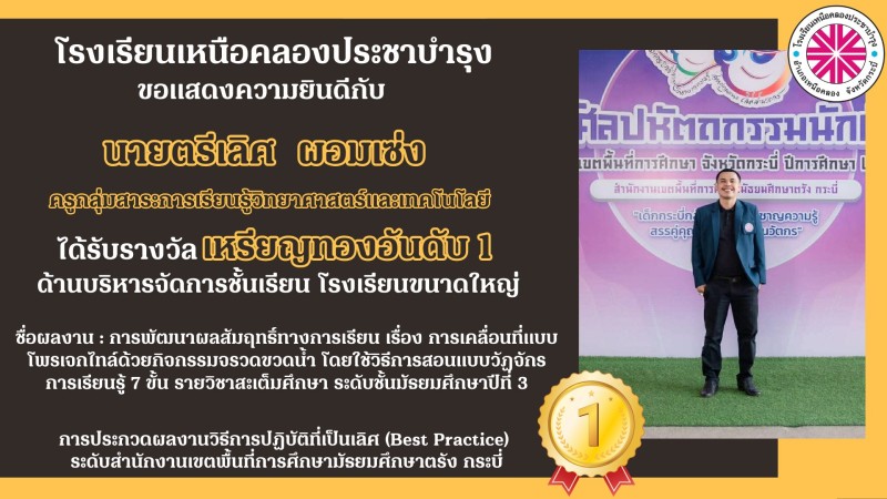 โรงเรียนเหนือคลองประชาบำรุง ขอแสดงความยินดีกับคณะผู้บริหาร คณะครูและบุคลากรทางการศึกษาที่ได้รับรางวัลการประกวดผลงานวิธีการปฏิบัติที่เป็นเลิศ (Best Practice) ระดับสำนักงานเขตพื้นที่การศึกษามัธยมศึกษาตรัง กระบี่ ด้วยความยินดียิ่ง |