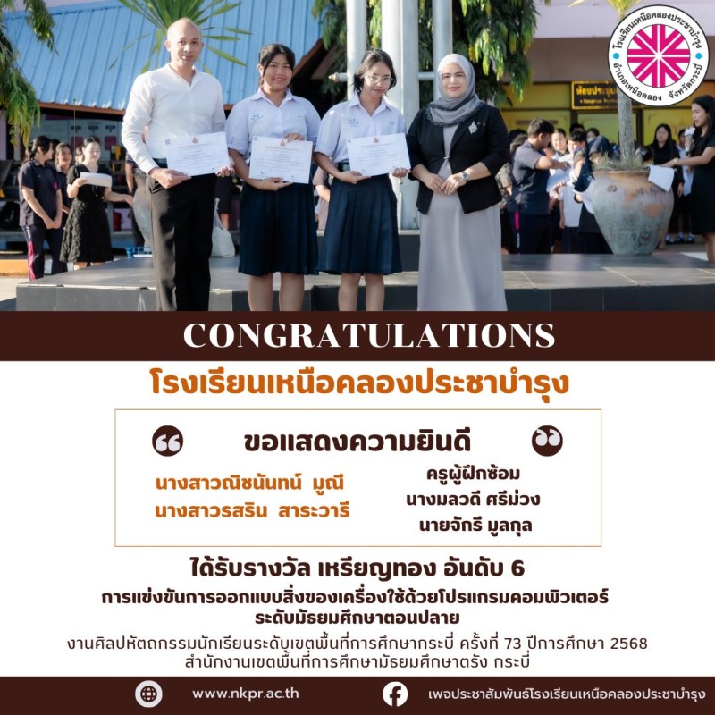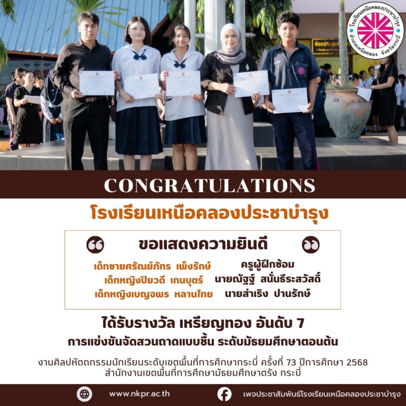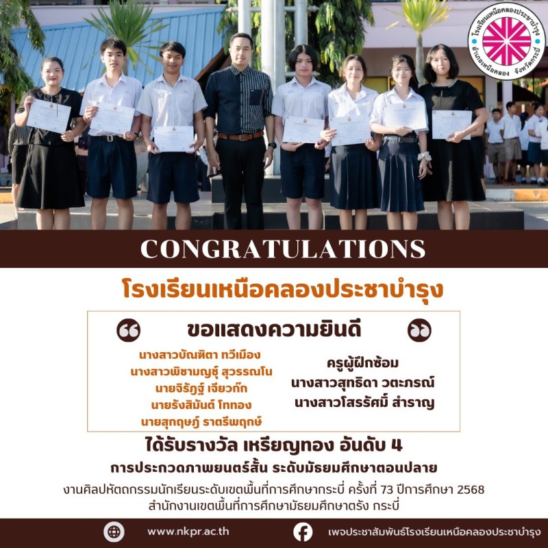 ขอแสดงความยินดีกับตัวแทนนักเรียนและคุณครูผู้ฝึกซ้อมที่ได้รับรางวัลในการแข่งขันงานศิลปหัตถกรรมนักเรียนระดับเขตพื้นที่การศึกษากระบี่ ครั้งที่ 73 ปีการศึกษา 2568