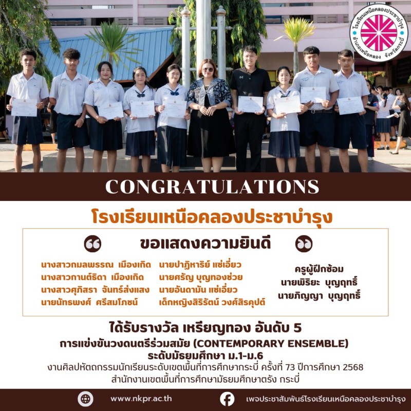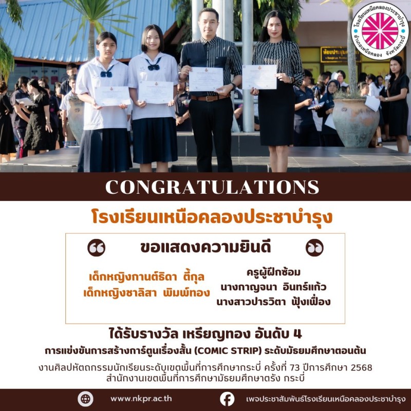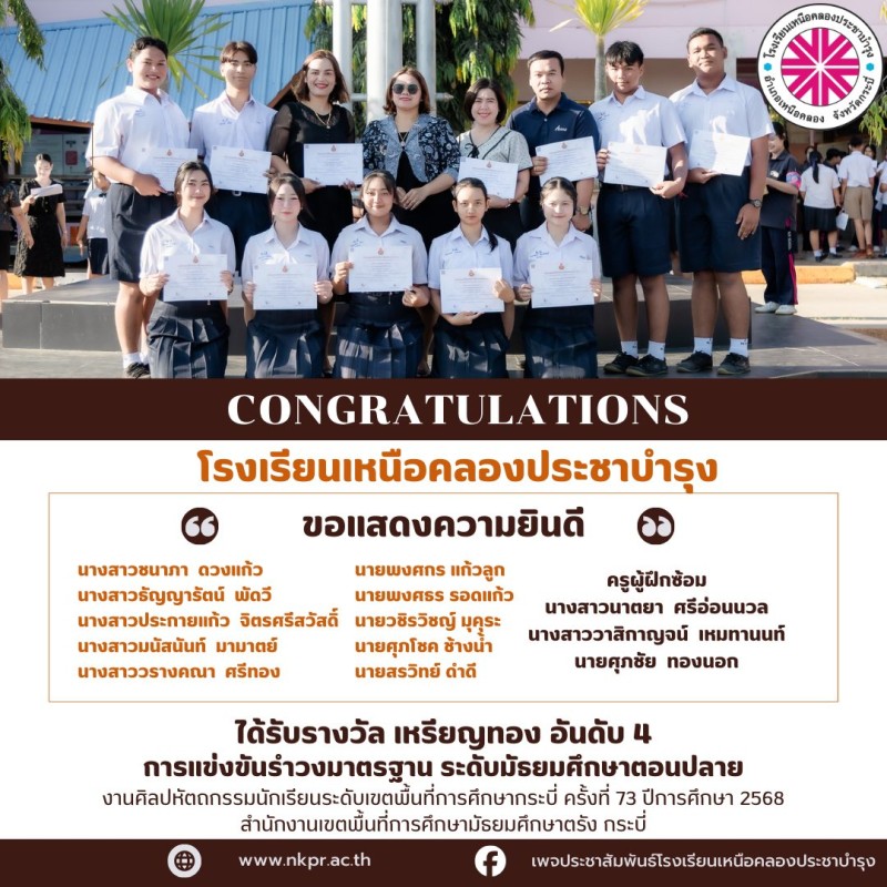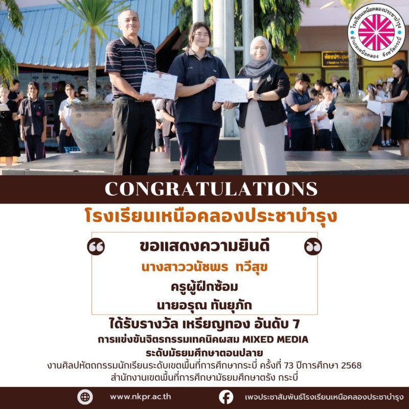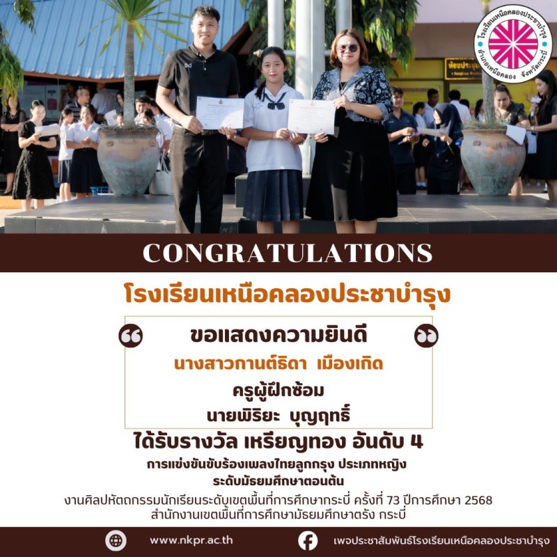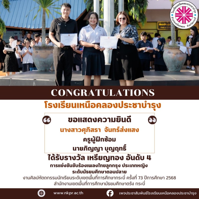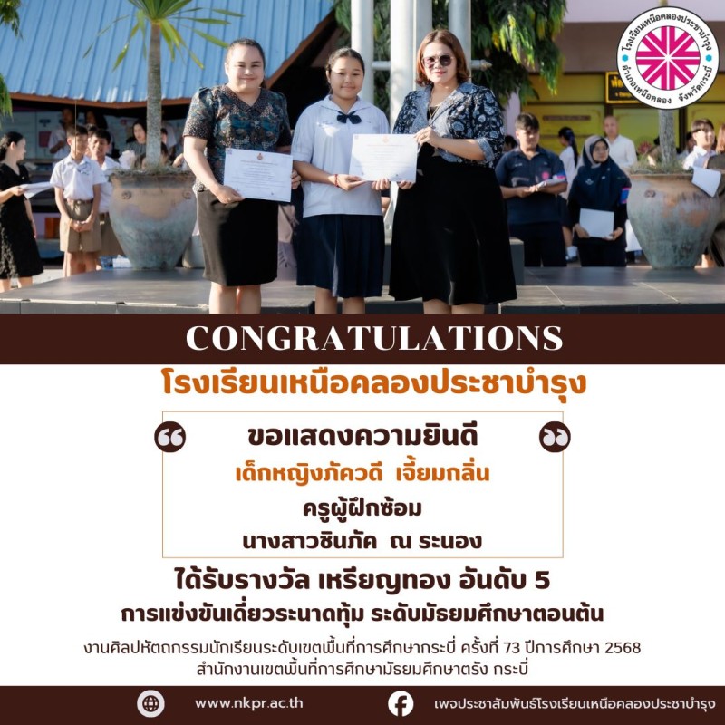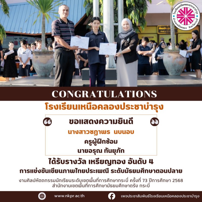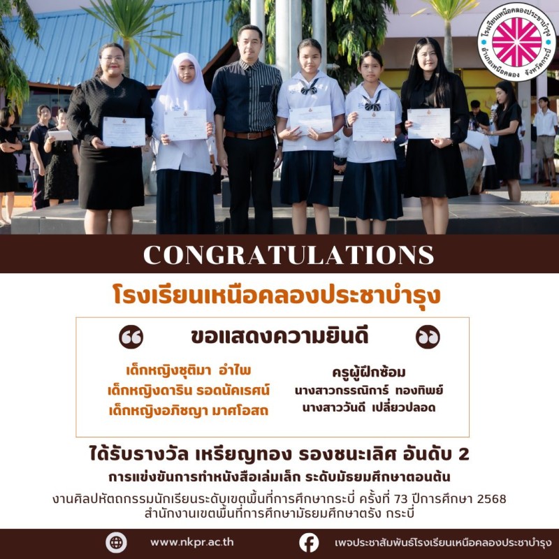 ในนามของคณะกรรมการสถานศึกษา คณะผู้บริหาร คณะครู บุคลากรทางการศึกษาและนักเรียนโรงเรียนเหนือคลองประชาบำรุง ขอแสดงความยินดีกับตัวแทนนักเรียนและคุณครูผู้ฝึกซ้อมที่ได้รับรางวัลในการแข่งขันงานศิลปหัตถกรรมนักเรียนระดับเขตพื้นที่การศึกษากระบี่ ครั้งที่ 73 ปีการศึกษา 2568 สํานักงานเขตพื้นที่การศึกษามัธยมศึกษาตรัง กระบี่ ณ โรงเรียนอ่าวลึกประชาสรรค์ด้วยความยินดียิ่ง |