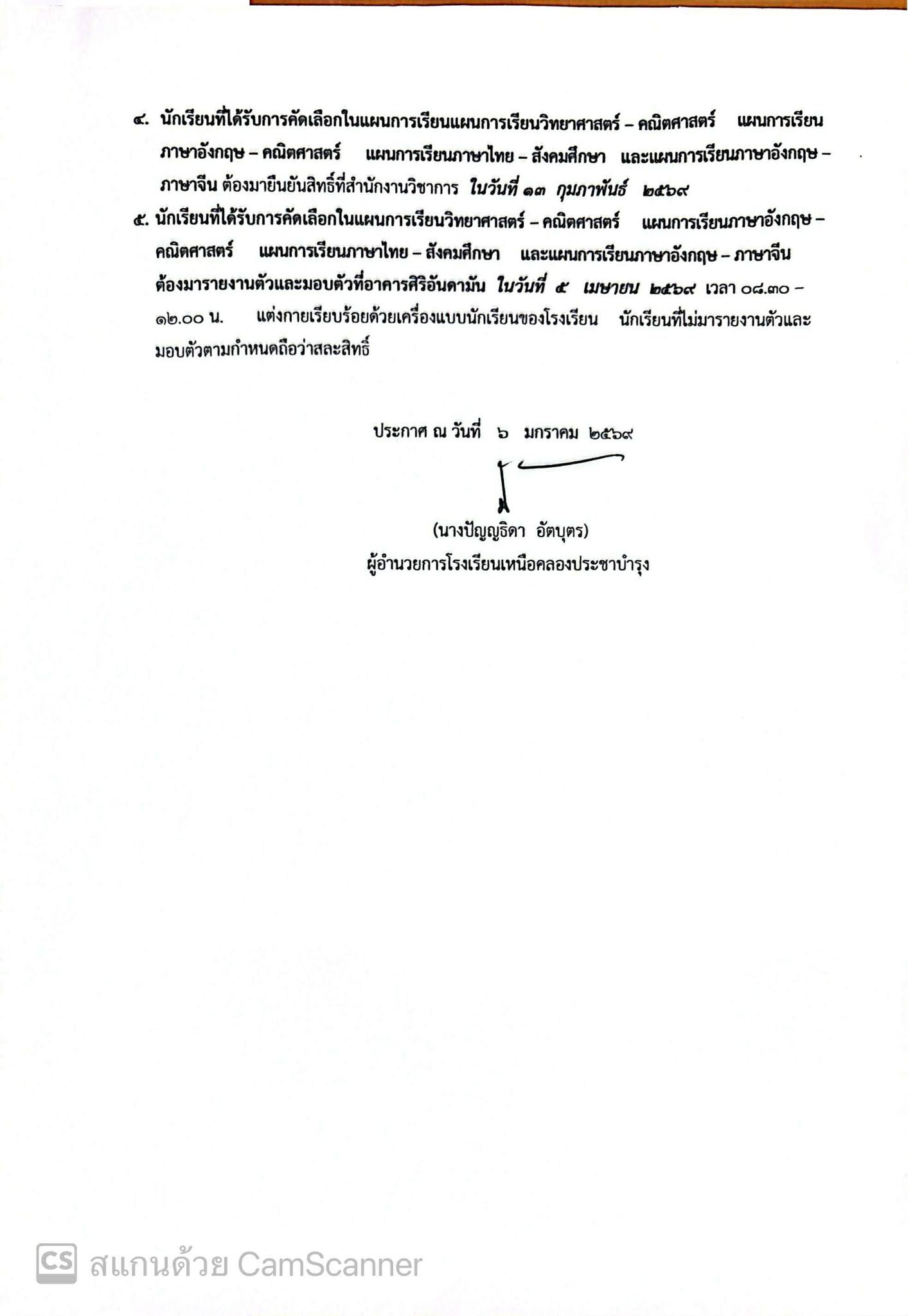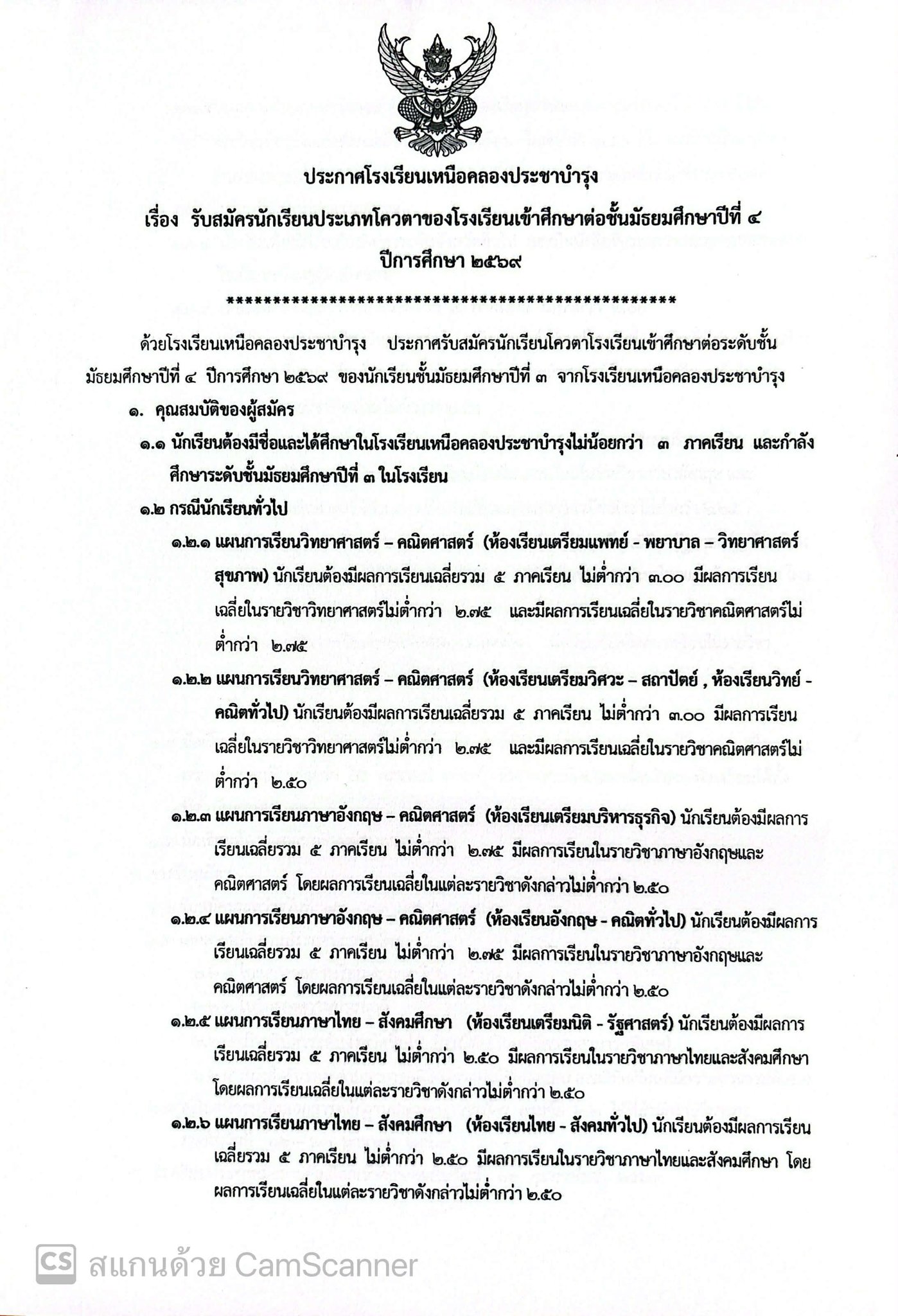 ประกาศโรงเรียนเหนือคลองประชาบำรุง เรื่อง รับสมัครนักเรียนประเภทโควตาของโรงเรียนเพื่อเข้าศึกษาต่อชั้นมัธยมศึกษาปีที่ 4 ปีการศึกษา 2569