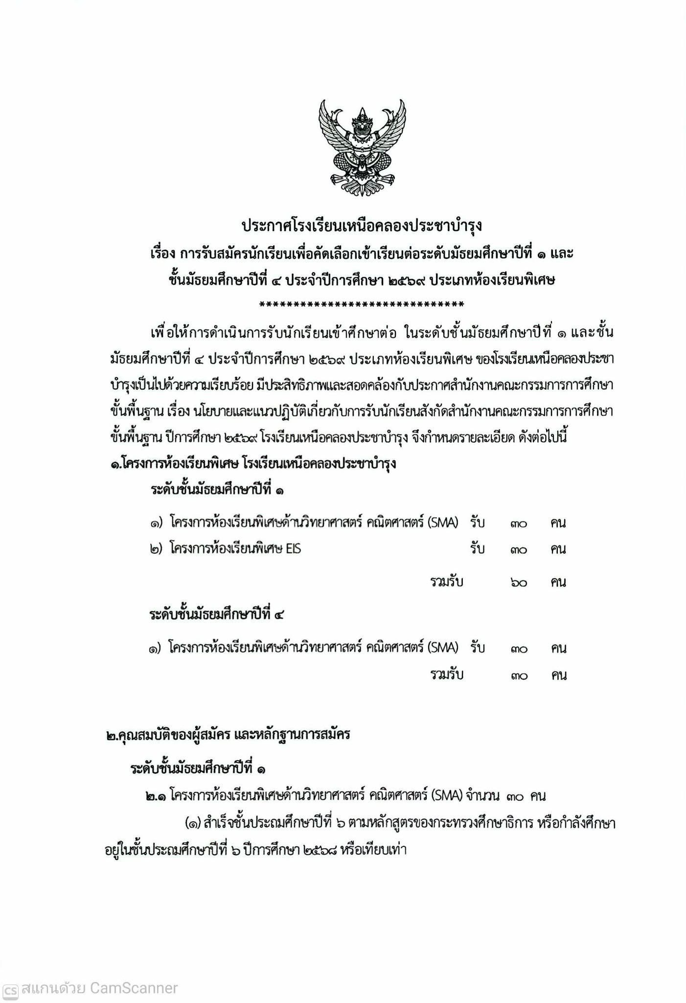 ประกาศการรับสมัครนักเรียนเพื่อคัดเลือกเข้าศึกษาต่อระดับชั้นมัธยมศึกษาปีที่ 1 และชั้นมัธยมศึกษาปีที่ 4 ประจำปีการศึกษา 2569 ประเภทห้องเรียนพิเศษ