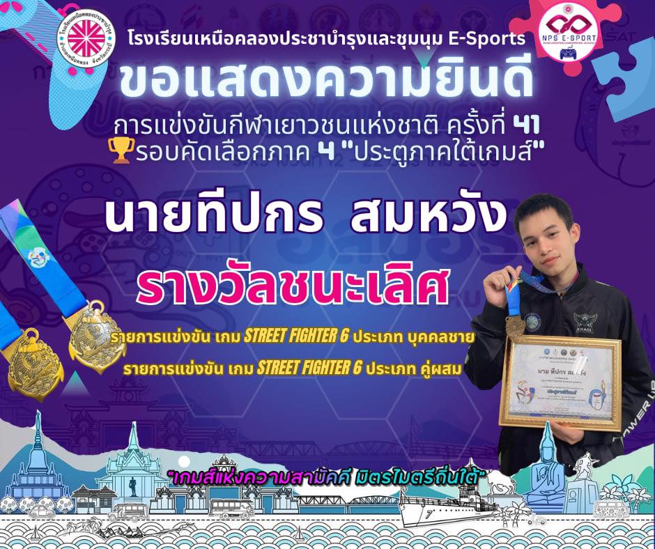 | คณะผู้บริหาร คณะครูและบุคลากรทางการศึกษาโรงเรียนเหนือคลองประชาบำรุง ขอแสดงความยินดีกับ นายทีปกร สมหวัง นักเรียนชั้นมัธยมศึกษาปีที่ 4/4 ที่ได้รับรางวัลชนะเลิศ รายการแข่งขัน เกม Street Fighter 6 ประเภทบุคคลชายและคู่ผสม การแข่งขันกีฬาเยาวชนแห่งชาติ ครั้งที่41 รอบคัดเลือกภาค 4 ประตูภาคใต้เกมส์ ขออำนวยพรให้นักเรียนประสบความสำเร็จตามเป้าหมายที่ตั้งไว้ ประสบการณ์ ความพยายามที่ได้รับนับเป็นคุณค่าอันสำคัญ และเป็นความภาคภูมิใจของโรงเรียนขอเป็นกำลังใจให้นักเรียนทำอย่างเต็มที่ |