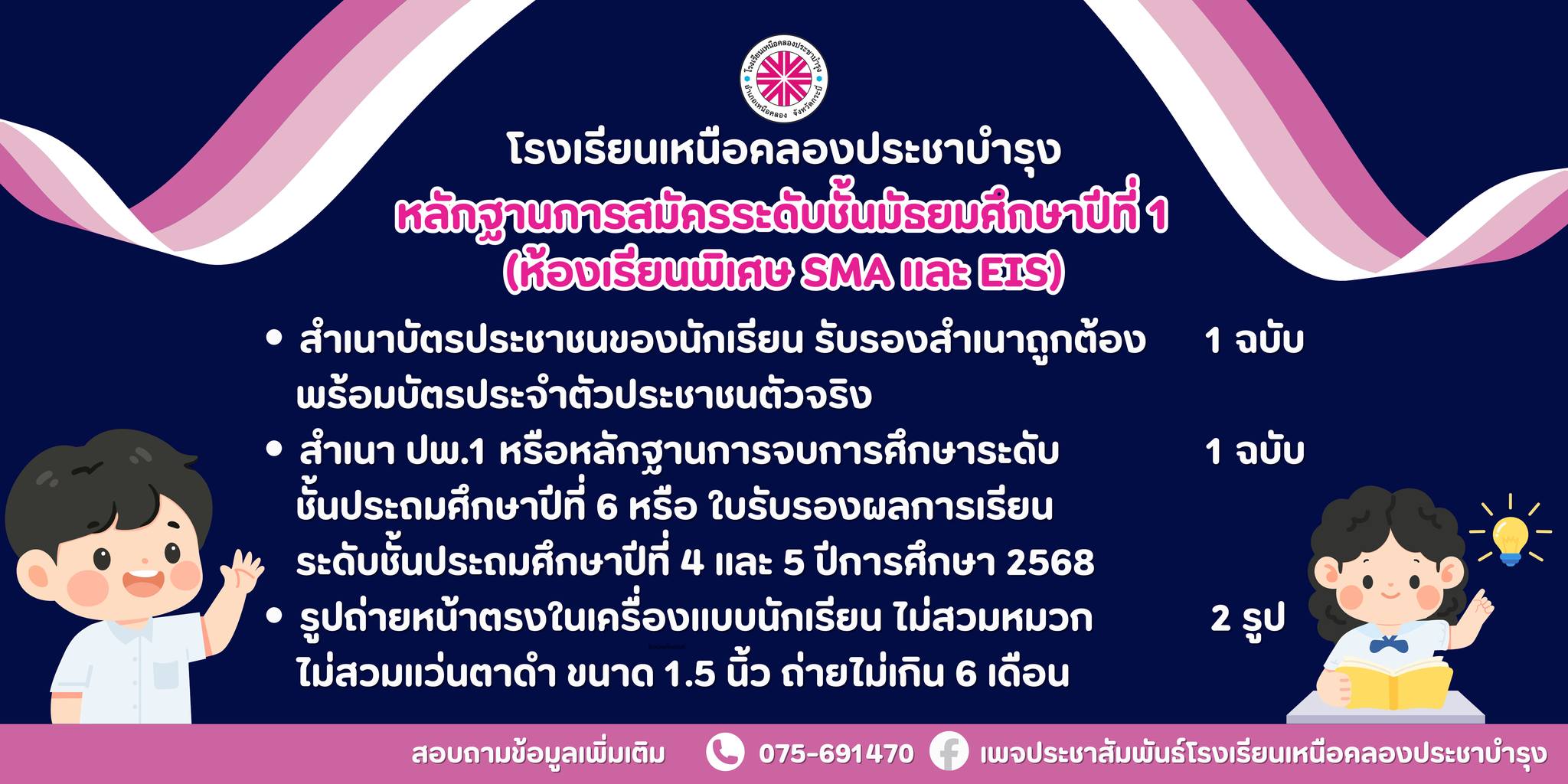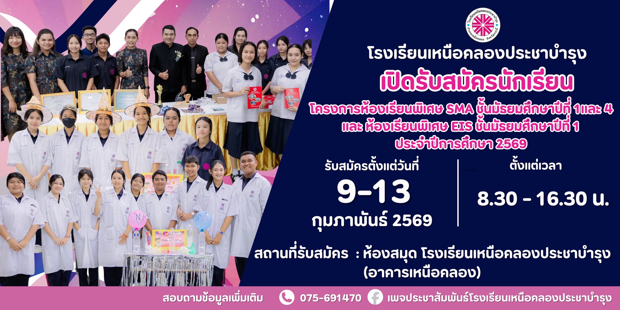 ประกาศโรงเรียนเหนือคลองประชาบำรุง เรื่องการรับนักเรียนเพื่อเข้าศึกษาต่อในระดับชั้นมัธยมศึกษาปีที่ 1และ 4 ห้องเรียนพิเศษ SMA และ EIS ประจำปีการศึกษา 2569