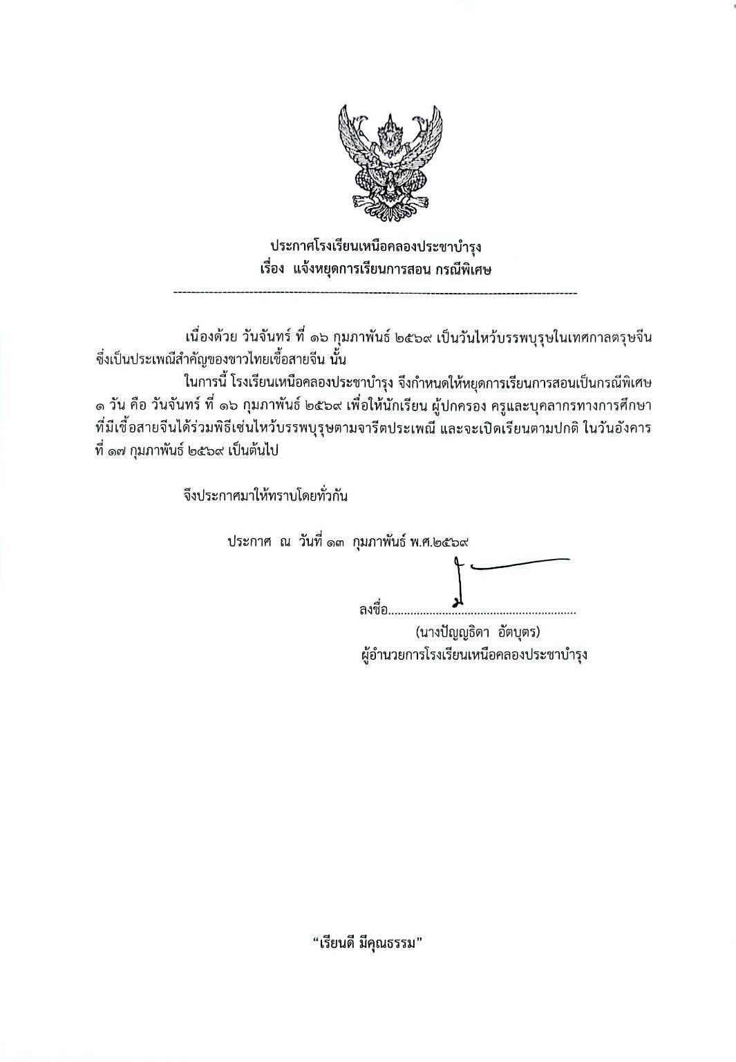 ประกาศโรงเรียนเหนือคลองประชาบำรุง เรื่อง แจ้งหยุดการเรียนการสอนกรณีพิเศษ ในวันที่ 16 กุมภาพันธ์ 2569
