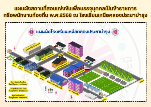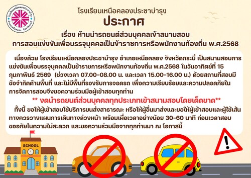 ประกาศโรงเรียนเหนือคลองประชาบำรุง เรื่อง ไม่อนุญาตให้นำรถยนต์ส่วนบุคคลเข้าสนามสอบ และแผนผังสถานที่สอบแข่งขันเพื่อบรรจุบุคคลเป็นข้าราชการหรือพนักงานท้องถิ่น พ.ศ.2568 วันอาทิตย์ที่ 15 กุมภาพันธ์ 2569