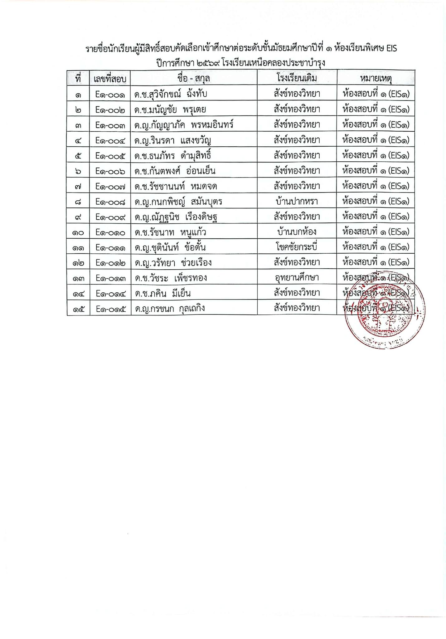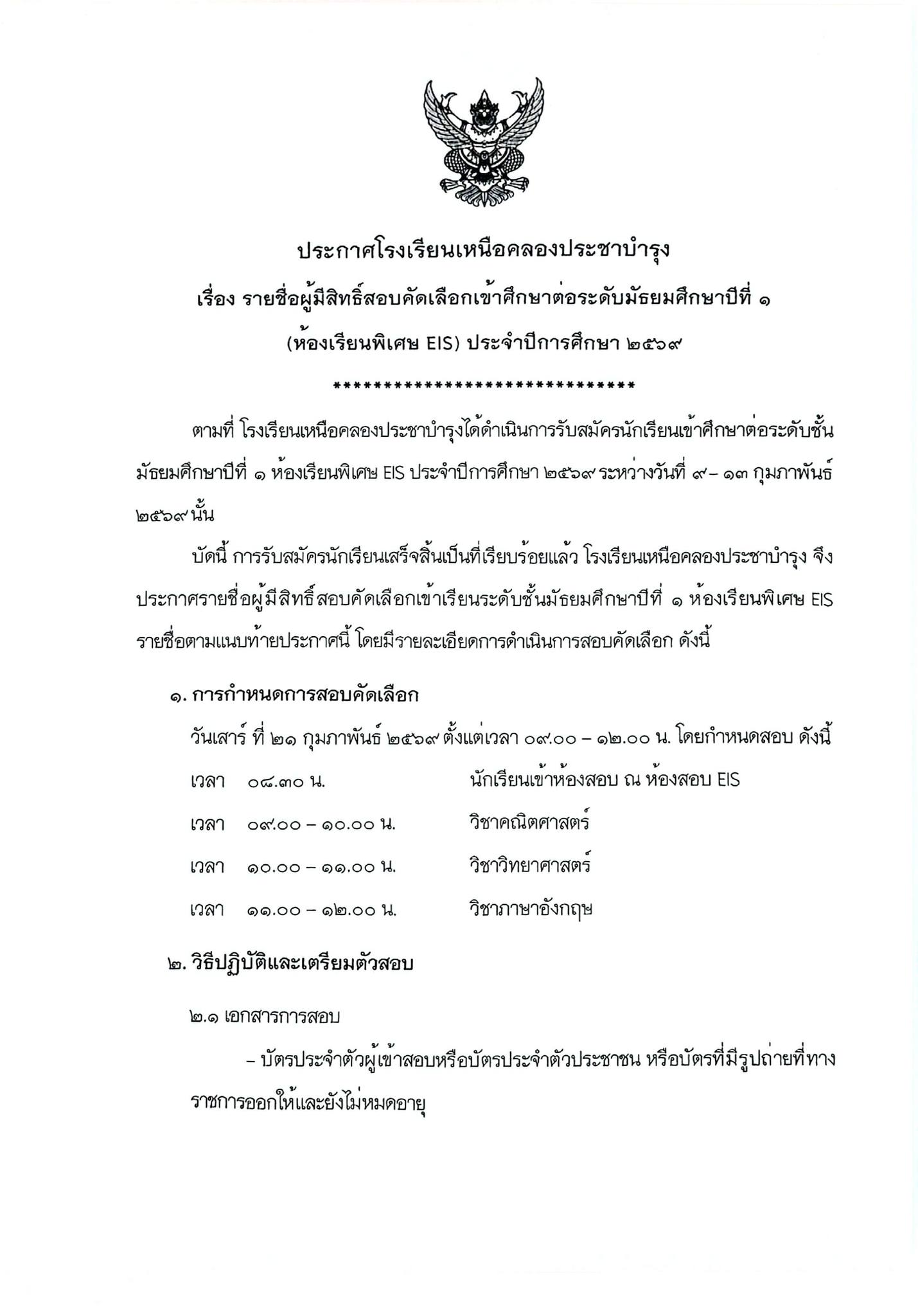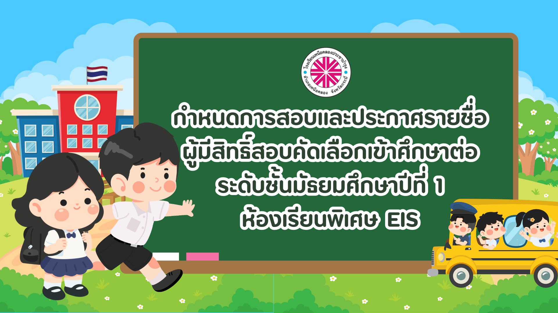 ประกาศโรงเรียนเหนือคลองประชาบำรุง เรื่อง รายชื่อผู้มีสิทธิ์สอบคัดเลือกเข้าศึกษาต่อระดับชั้นมัธยมศึกษาปีที่ 1 (ห้องเรียนพิเศษ EIS)